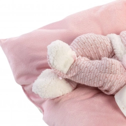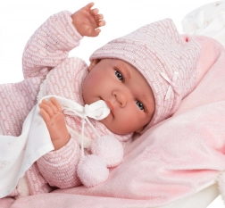 De pop is gekleed in een roze gebreide outfit met een muts en schoentjes voor een realistische look tijdens het spelen.