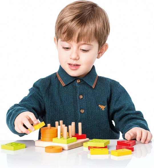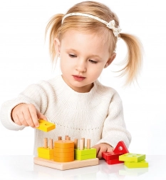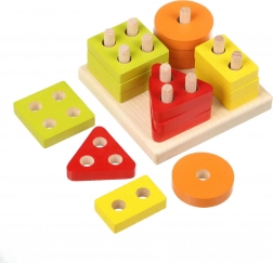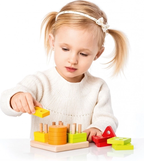 Kleurige cirkels, vierkanten, driehoeken en rechthoeken met gaten worden op de pinnetjes van de basis geplaatst. Kinderen sorteren zo vanzelf op vorm en kleur en trainen hun logisch denken.