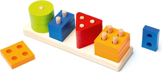 Deze kwalitatieve houten sorteerpuzzel biedt 16 kleurrijke geometrische vormen die op pinnetjes op een rechthoekige basis worden geregen. Tijdens het spelen leren kinderen kleuren en vormen herkennen, proberen ze verschillende combinaties uit en trainen ze op natuurlijke wijze hun coördinatie en geduld.