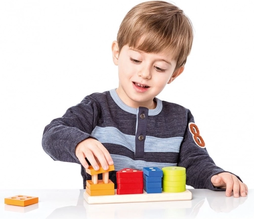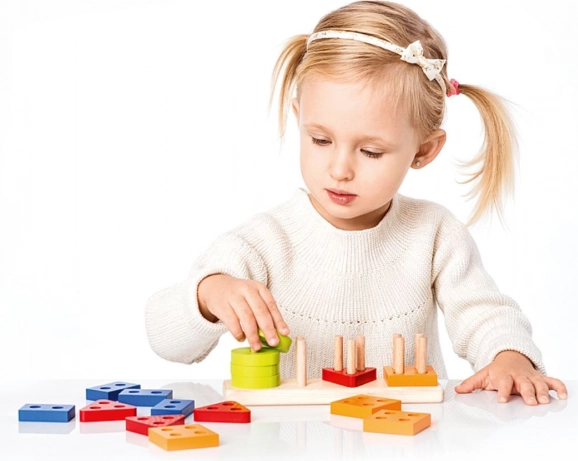 Het rijgen van de stukjes op de pinnetjes versterkt de oog–handcoördinatie, grijpnauwkeurigheid en concentratie – sleutelvaardigheden voor de voorschoolse leeftijd.