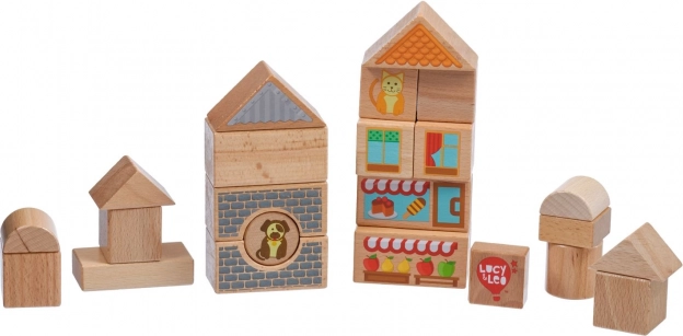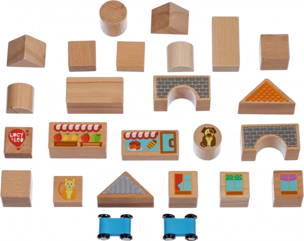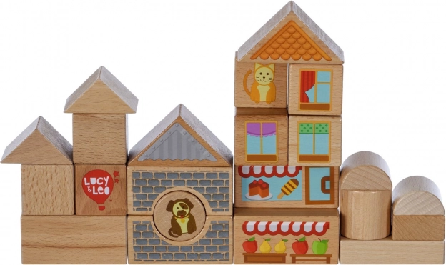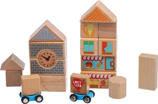 Ontdek de magie van creatief bouwen met de houten set Lucy & Leo stad. De set bevat 25 hoogwaardige houten delen, waaronder 2 rijdende autootjes, in verschillende vormen en kleuren om huisjes en straatjes te bouwen. Geïllustreerde elementen zoals ramen, daken en etalages prikkelen de fantasie en thematisch spel. Het speelgoed ondersteunt fijne motoriek, logisch denken en creativiteit, en na het spelen berg je alles eenvoudig op in de praktische ronde box met deksel en handvat.