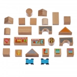 Bouw je eigen schilderachtig stadje van zorgvuldig vervaardigde houten blokken en ga op pad met twee kleine autootjes. Delen in verschillende vormen – balken, driehoeken, cilinders en bruggetjes – combineren perfect en motiveren kinderen tot creatief bouwen en vrij spel.