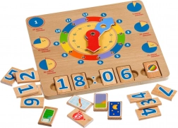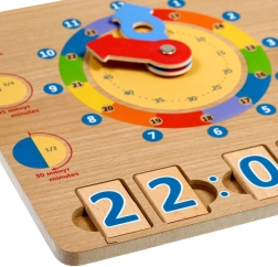 De set bevat 14 cijferblokjes en 6 blokjes met afbeeldingen van dagelijkse activiteiten. Vier tijdsblokjes kunnen in de voorbereide uitsparingen worden geplaatst om een digitale tijd te vormen, terwijl het vijfde blokje de bijbehorende activiteit weergeeft. Zo koppelen kinderen visueel de analoge klok aan de digitale notatie en aan het gewone dagritme.