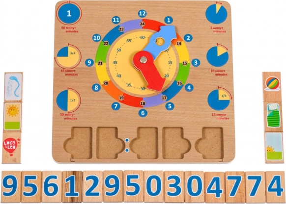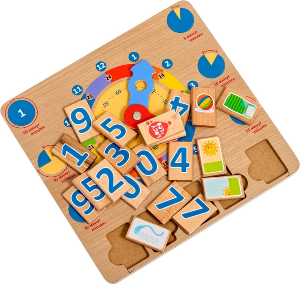 De houten speelplaat We leren klokkijken is een uitstekende didactische tool die natuurlijk leren door spel ondersteunt. Grote kleurrijke wijzers en duidelijk onderscheiden tijdssegmenten maken het voor kinderen makkelijker om uren, minuten en dagelijkse activiteiten op specifieke tijdstippen te begrijpen.