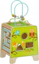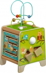 Uitneembaar en draaibaar labyrint met metalen draden en kralen traint de coördinatie van de vingertjes en de concentratie. Kan omgekeerd in de kubus worden opgeborgen voor veilig opbergen.