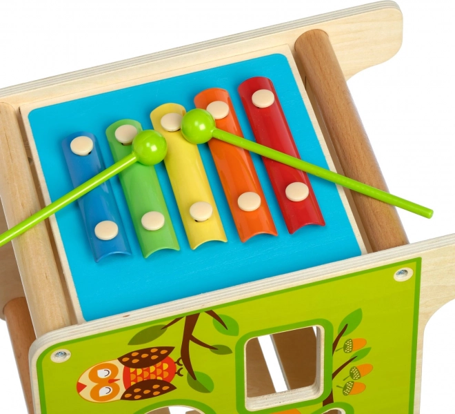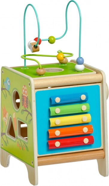 Deze kleurrijke houten activiteitenkubus biedt kinderen uren zinvol spel. Het bovenste kralenlabyrint kan worden verwijderd en omgekeerd in de kubus worden geplaatst voor eenvoudig opbergen. Op de zijkanten ontdekken kinderen een xylofoon met stokjes, een vormenstoof met tweedelige draaiende geometrische vormen, een motorisch doolhof, een roterend wieltje, draaielementen en een leuke activiteit met het verschuiven van een pinnetje in een groef.