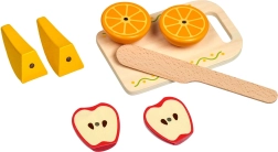 De set bevat alles voor kleine koks: een dienblad met ruitpatroon, snijplank, mes, zoutvaatje en peperbus, evenals een gevarieerde selectie etenswaren – brood, kaas en sla, ei, banaan, appel, sinaasappel, aardbei en een klein taartje. De nadruk op kwalitatieve materialen en duurzame afwerking garandeert een lange levensduur en veilig spel.