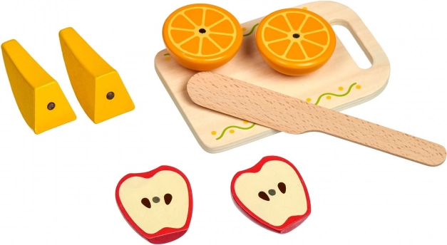 De afzonderlijke stukjes worden door magneten bij elkaar gehouden, zodat kinderen ze veilig kunnen “snijden” en opnieuw samenvoegen. Perfect voor motoriektraining en realistisch spel.