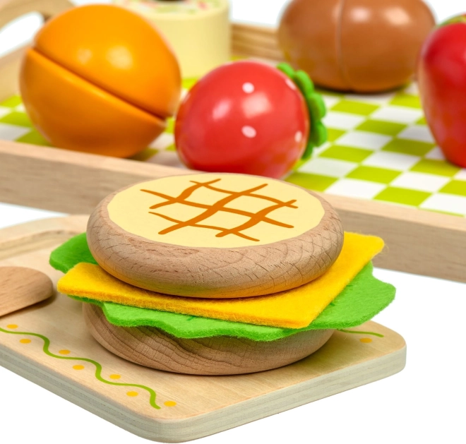 Stevige houten componenten worden aangevuld met textiele plakjes kaas en sla. Duurzame uitvoering en levendige kleuren zorgen voor lang en veilig speelplezier.