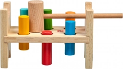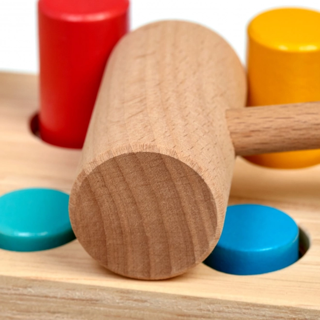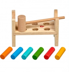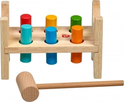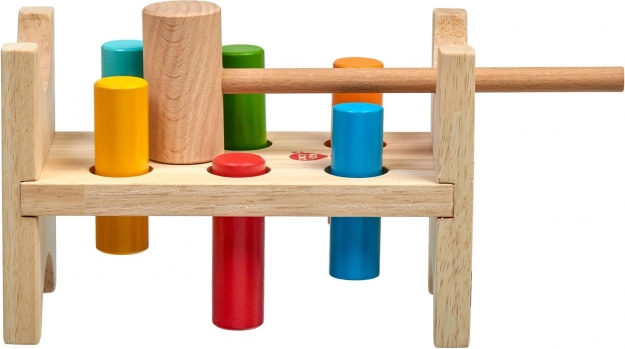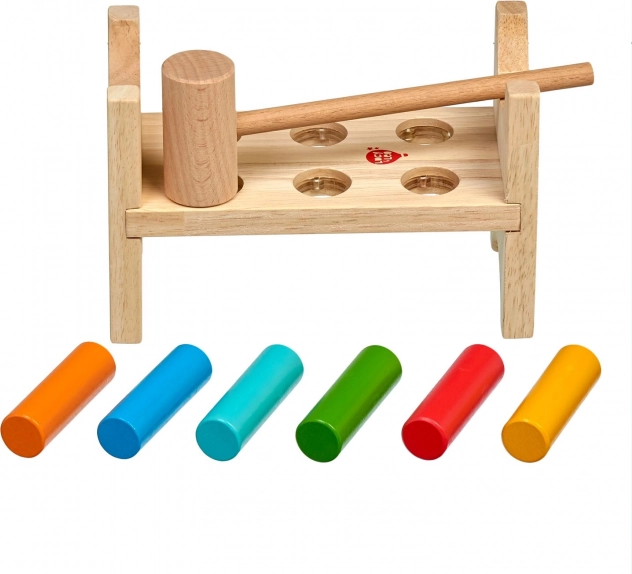 Zes gekleurde pinnen en een houten hamertje leren kinderen een precieze greep, slagkracht en oog-handcoördinatie.