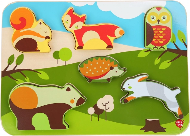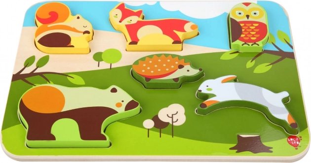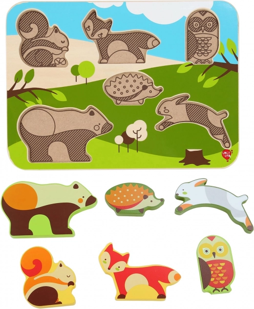 De Lucy & Leo inlegpuzzel met bosdieren bevat 7 gekleurde houten stukjes zonder knopjes, die kinderen gemakkelijk kunnen vastpakken en in de overeenkomstige uitsparingen kunnen plaatsen. Elk stukje is dik genoeg om zelfstandig te blijven staan, wat de speelmogelijkheden en fantasie vergroot.