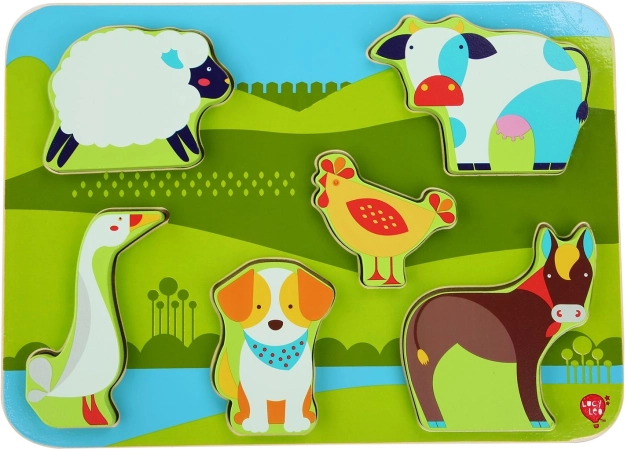 Ontdek de kleurrijke houten inlegpuzzel met boerderijthema van LUCY & LEO, ideaal voor kinderen vanaf 3 jaar. Bevat 7 stevige dierstukjes die gemakkelijk vast te houden zijn en in de gefreesde uitsparingen passen. Het speelgoed stimuleert fijne motoriek, herkennen van vormen en dieren en geduld. De stukjes zijn voldoende groot en stabiel, zodat ze ook zelfstandig kunnen staan.
