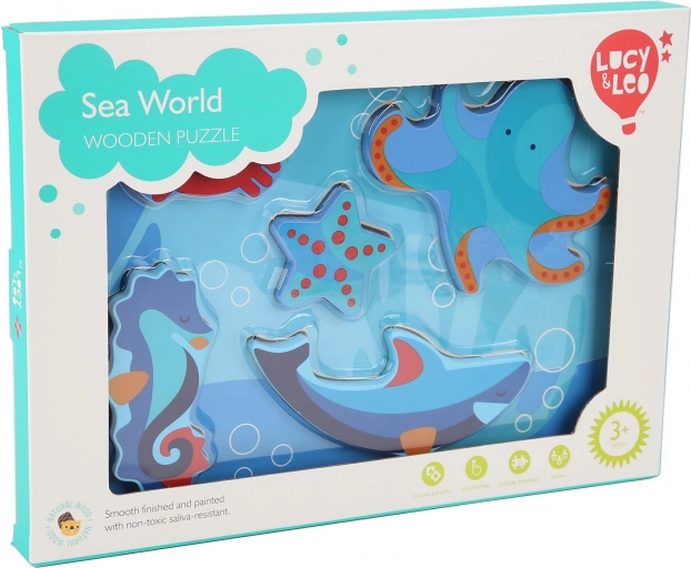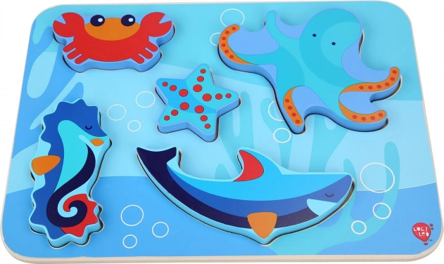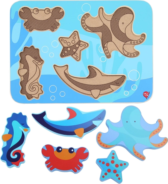 De houten kinderpuzzel met het thema zeedieren is ontworpen voor spelenderwijs leren. Zes kleurrijke stukjes – bijvoorbeeld een octopus, zeester en zeepaardje – passen precies in de gefreesde vormen op de stevige basis met oceaanthema. De stukken zijn groot genoeg om goed vast te houden en kunnen dankzij hun dikte zelfstandig staan.