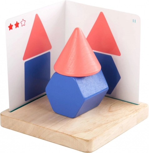 Kinderen ordenen cilinders, kegels, kubussen en andere vormen volgens het voorbeeld, waardoor ze logisch denken en visuele waarneming versterken.