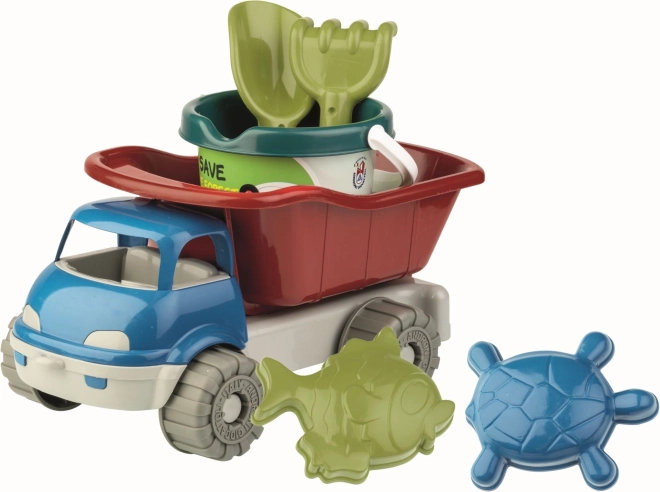 Androni zandset gemaakt van gerecycled plastic biedt plezier voor kleine kinderen. Bevat een autootje, emmer, schep, harkjes en twee vormen met een zee thema, ideaal voor zand of strand.