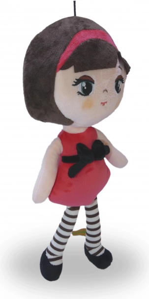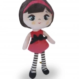 De pop is gekleed in een rode jurk met een zwarte strik die de aandacht trekt.