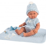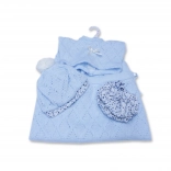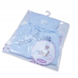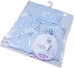 De outfit voor een babypop van 26 cm bevat een truitje, een mutsje en een broekje. Hij is ontworpen om maximaal comfort en elegantie aan het poppenspel toe te voegen. De set bevat ook een fijn gebreid dekentje dat de look compleet maakt. Deze set is verpakt in een transparante verpakking met een plastic of kartonnen hangertje.