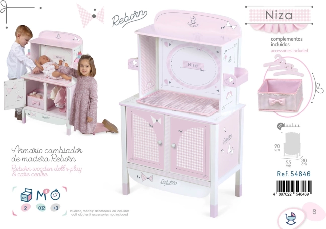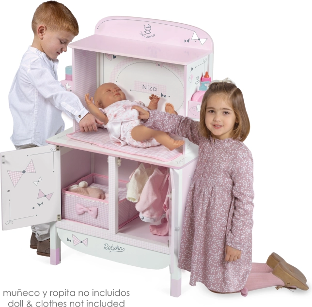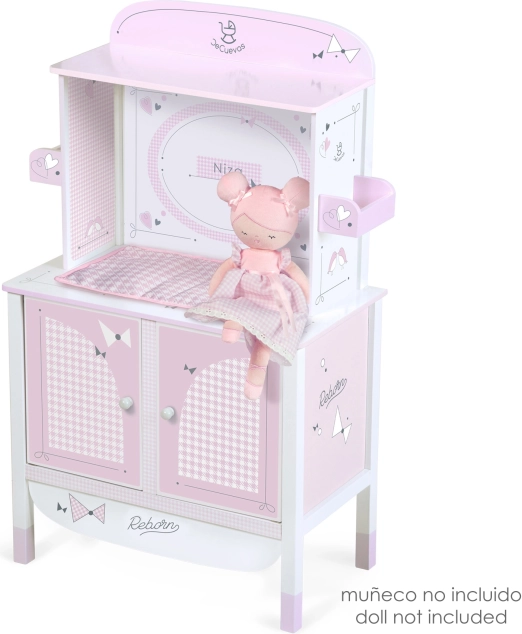 Dankzij het precisie Spaans design en zorgvuldig gekozen materialen oogt de kast licht en strak. Praktische afmetingen zorgen voor stabiliteit en voldoende ruimte voor alle benodigdheden voor de verzorging van een pop tot 45 cm.