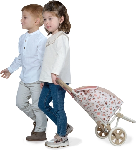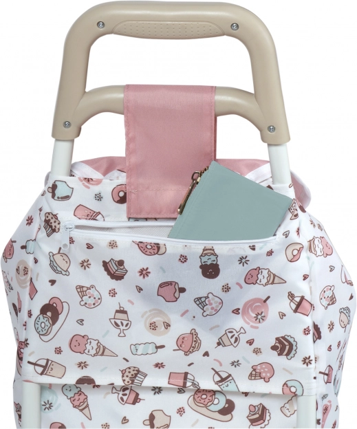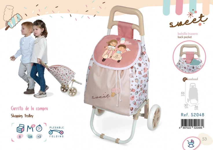 De opvouwbare reistrolley DeCuevas SWEET is de ideale metgezel voor kleine dametjes die graag reizen met een pop of een handige en stijlvolle accessoire voor boodschappen nodig hebben. Het zal je betoveren met de harmonieuze combinatie van zalmroze, beige en witte kleuren, aangevuld met zachte motieven van taartjes en ijsjes.