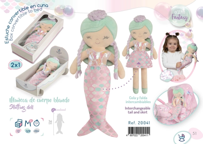 De pluchen pop Ocean Fantasy uit de collectie 2021 zal elk meisje betoveren met zijn prachtig Spaans design. Het komt met een stoffen hoes die de staart van een zeemeermin voorstelt, wat transformatie naar een meisje mogelijk maakt. Deze multifunctionele set bevat ook een decoratieve cadeauverpakking, die kan worden omgebouwd tot een wieg.<p>