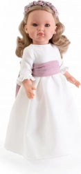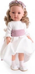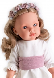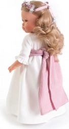 De zachte witte jurk met strik en bloemenhaarband versterkt de charme van de pop. Geselecteerde collecties gebruiken biologisch katoen dat zonder chemische behandeling is geteeld.
