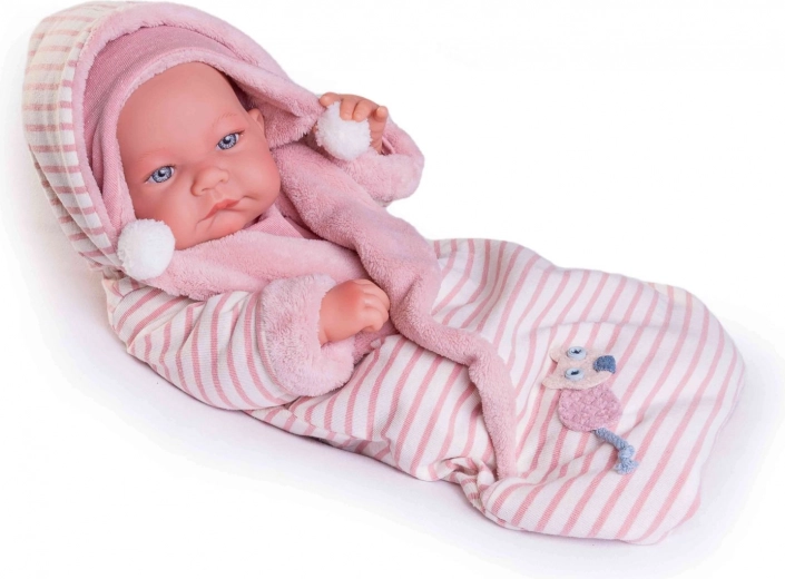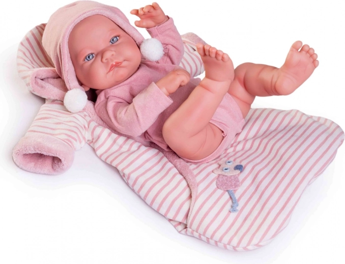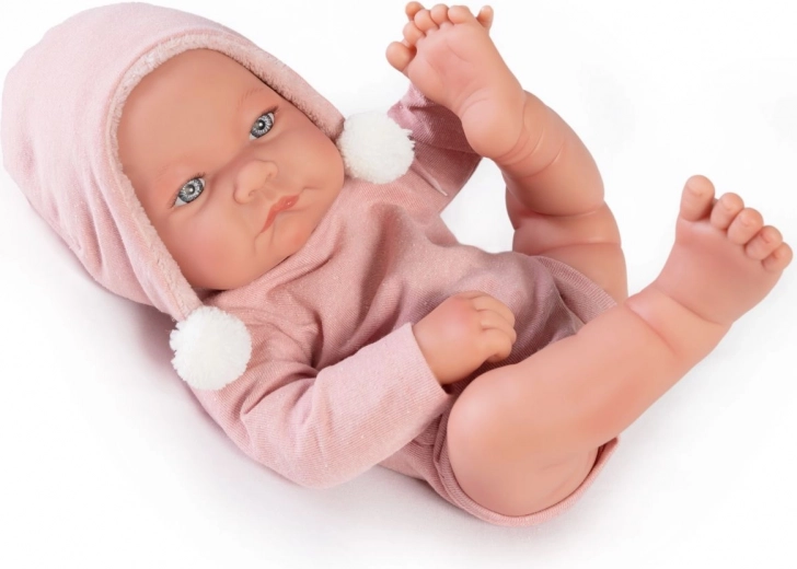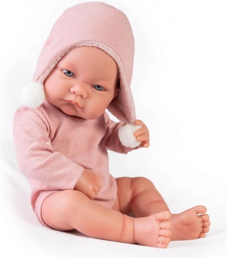 Deze handgemaakte Spaanse pop stelt een pasgeboren baby voor met uiterst levensechte babyplooitjes en anatomische details. Het volledige lichaam is gemaakt van zacht vinyl, dat prettig aanvoelt en bestand is tegen dagelijks spelen. De babypop kan ook in bad – let er wel op dat de wimpers niet nat worden.