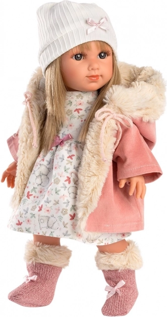 Met aandacht voor detail en kwaliteit, is pop Elena gekleed in een roze jas met bontkraag en een witte jurk met bloemenpatroon.