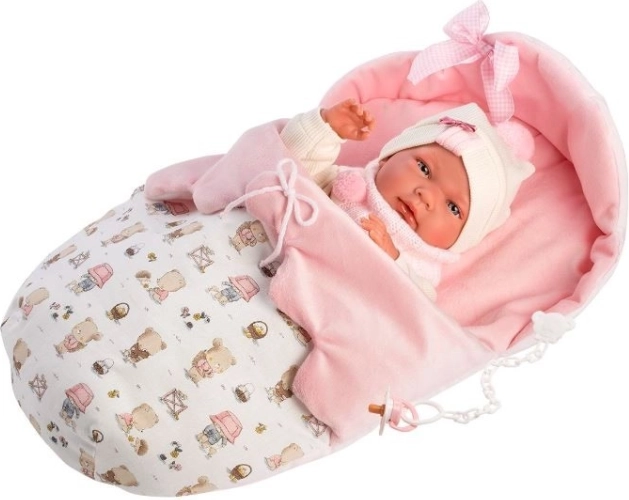 De pop is uitgerust met een stijlvolle outfit bestaande uit een body, een hoed, sokken, een jasje en een slaapslaapzak. De gehele outfit is gemaakt van kwalitatieve stoffen van gerenommeerde kindermerkkleding fabrikanten.