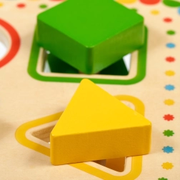 De plaat op stabiele pootjes heeft vier kleur omrande openingen die matchen met de kleuren van de afzonderlijke stukjes. De set is ideaal voor zelfstandig spel of samen ontdekken met ouders en is een uitstekende houten educatieve speelgoed voor kleuters.