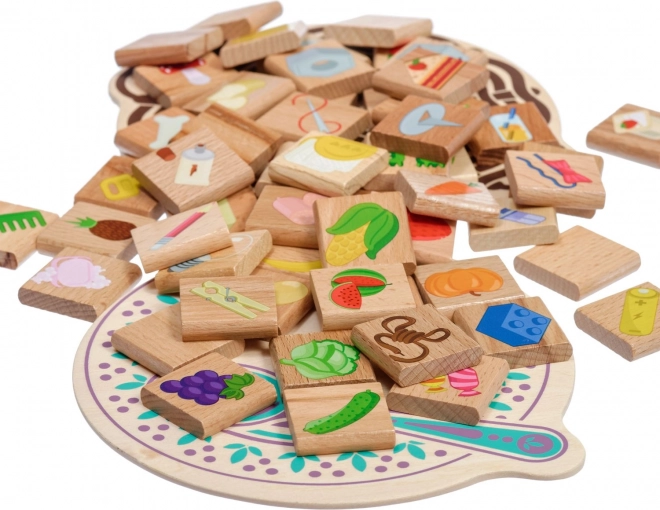Dit doordachte Montessori-materiaal leert kinderen onderscheiden wat geschikt is om te eten en wat niet. Op de houten onderleggers staan een bord met lepel en een rieten mandje afgebeeld, waar de kinderen tegeltjes met afbeeldingen van fruit, groente, snoep of drankjes, maar ook sleutels, lampen, naalden of potloden bijleggen. Het spel ondersteunt op een natuurlijke manier wereldverkenning, concentratie en communicatieve vaardigheden.