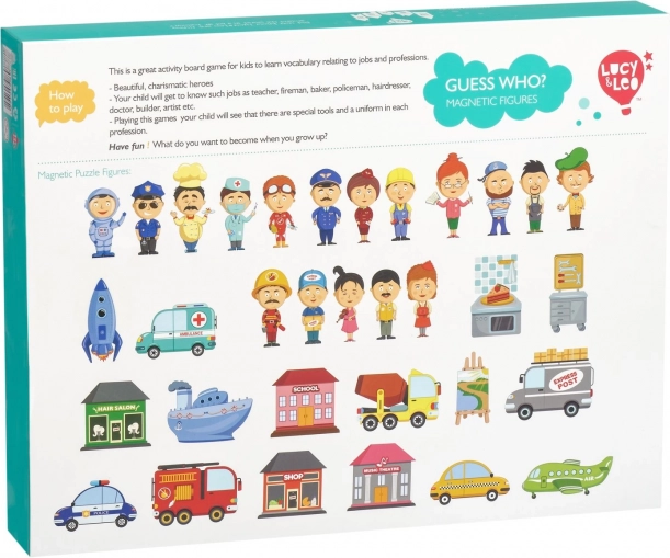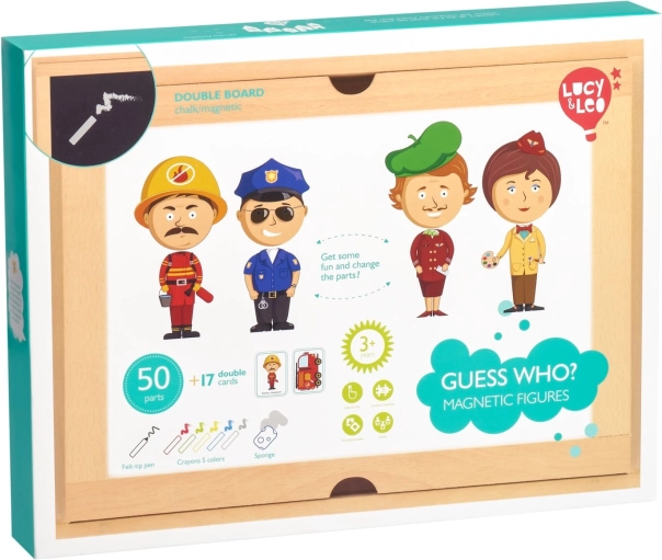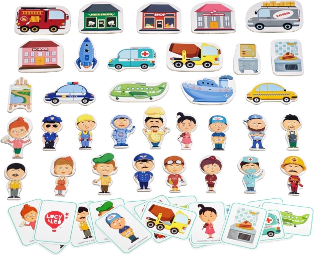 Deze creatieve magnetische set brengt de wereld van beroepen spelenderwijs dichterbij – van brandweerman en politieagent tot kok of piloot. Dankzij de dubbelzijdige kaarten kunnen kinderen de juiste combinaties leggen of eigen figuurtjes en scènes maken. Het praktische houten koffertje met magnetisch bord zorgt voor handig opbergen van alle onderdelen en gemakkelijk meenemen op reis.