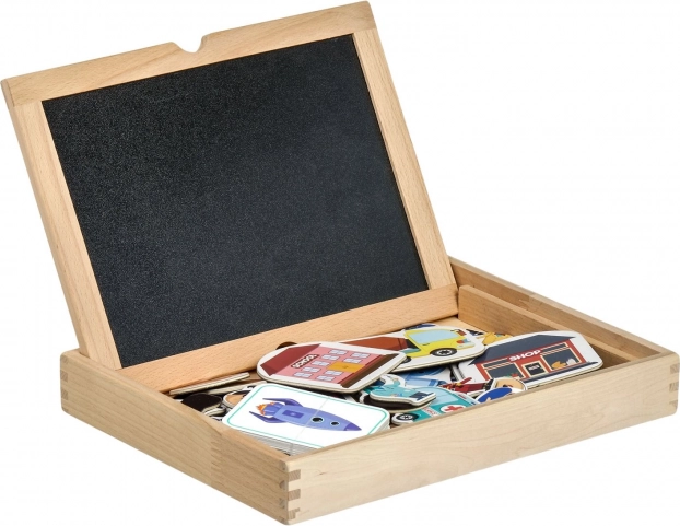Het deksel fungeert als magnetisch wit en zwart bord. Met de bijgeleverde stift, krijtjes en wisser kunnen kinderen tekenen, schrijven en alles gemakkelijk uitwissen.