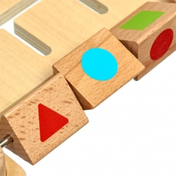 Gekleurde vormen worden over de rails verplaatst zodat ze overeenkomen met het voorbeeld. Kinderen trainen oog-handcoördinatie, concentratie en het stap-voor-stap oplossen van taken.