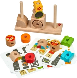 De interactieve puzzel “Dag en Nacht” combineert plezier en leren. Kinderen plaatsen kleurrijke geometrische vormen en blokken met dieren op drie pinnen volgens de bijgevoegde voorbeeldkaarten. Dagkaarten tonen kleuren, nachtkaarten leggen de nadruk op vormen – ideaal voor stapsgewijze oefening.