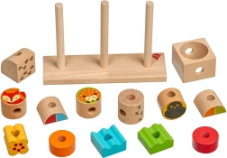 De stabiele voet en drie pinnen maken het rangschikken van de stukjes gemakkelijker. Kinderen trainen fijne motoriek en oog-handcoördinatie tijdens het rijgen en stapelen.