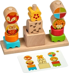 De set bevat een stevige houten basis, diverse blokken in verschillende formaten en 14 dubbelzijdige kaarten met uitdagingen. Op de dierenblokken staan motieven in de versie “dag” en “nacht”, wat een verhalend element aan het spel toevoegt. Na het spelen berg je alles eenvoudig op in de linnen zak.