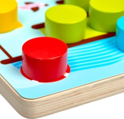 De grote houten pinnen zijn gemakkelijk vast te pakken en in de gaten te plaatsen, wat de oog-handcoördinatie ondersteunt en kleuren spelenderwijs laat leren.