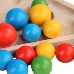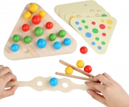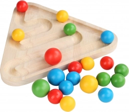 Ontdek creatieve fun en leren in één. De houten dubbelzijdige driehoekige plaat biedt twee activiteiten: het sorteren van gekleurde balletjes volgens 20 voorbeelden met de meegeleverde pincet en lepel, en een dynamisch doolhof waarin kinderen zowel geduld als precisie oefenen. De gekleurde balletjes worden na het spelen opgeborgen in het linnen zakje, zodat alles netjes bij elkaar blijft.