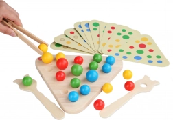 Kinderen sorteren gekleurde balletjes met behulp van een pincet en een lepel volgens de patronen op de kaarten – geweldig voor de ontwikkeling van de fijne motoriek, concentratie en het herkennen van kleuren.