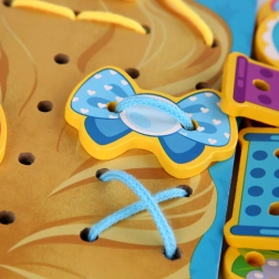 Rijgen en door de gaatjes steken versterkt de vingerspieren, de oog-handcoördinatie en de concentratie. Ideale activiteit voor kleuters.
