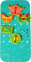 De houten rijgset Prinses biedt spelenderwijs leren en veel fantasierijk plezier. Op de grote onderplaat met de prinses kunnen kinderen hun eigen kapsels maken en versieren met kroontjes, strikjes of vlindertjes, die met veters in de voorgeboorde gaatjes worden bevestigd. De activiteit bevordert geduld, concentratie en de ontwikkeling van fijne motoriek.