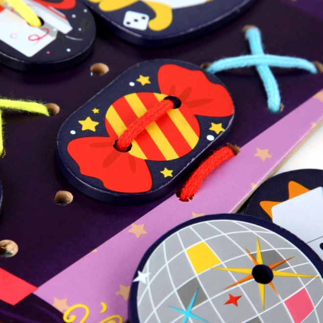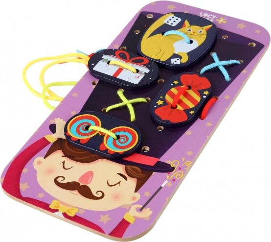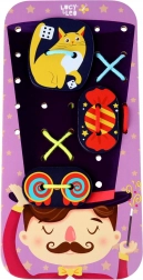 Deze leuke rijg- en doorsteekset met goochelaarthema neemt kinderen mee naar een wereld vol fantasie. Op de grote onderplaat met het hoofd van de goochelaar en zijn hoed kunnen ze met behulp van de veters kleurrijke accessoires bevestigen – van een konijntje en munten tot mysterieuze kaarten. Tijdens het spel oefenen kinderen oog-handcoördinatie, geduld en creativiteit.