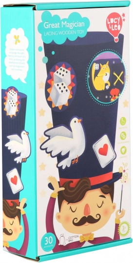 Ontdek de creatieve houten rijgset van Lucy & Leo, die de fijne motoriek, creativiteit en het herkennen van kleuren en vormen stimuleert. De set bevat 31 houten onderdelen, 4 gekleurde veters en een grote onderplaat met een goochelaar, waarop kinderen naar eigen fantasie versieringen kunnen doorrijgen en bevestigen.