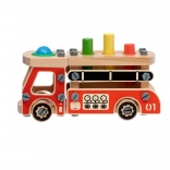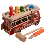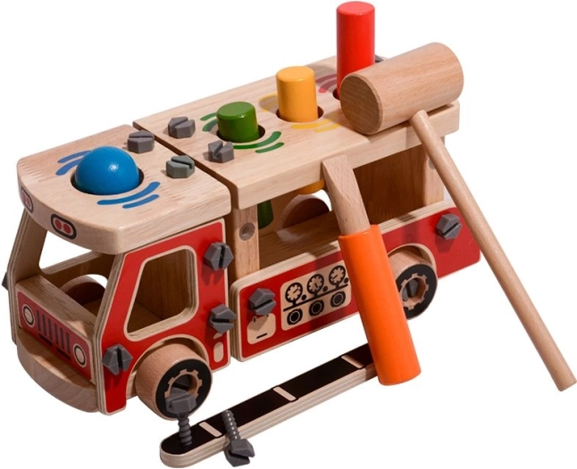 Deze creatieve set combineert een bouwset en hamerspel in één. Kinderen bouwen eerst een robuuste houten brandweerwagen en gebruiken vervolgens de vier openingen in de laadbak voor het leuk inslaan van gekleurde elementen met het hamertje. Dankzij de heldere kleuren en diverse vormen ondersteunt het speelgoed natuurlijk leren en concentratie.