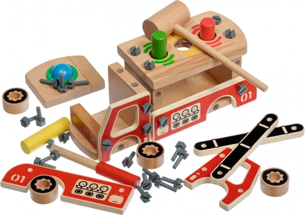 Bouw een functionele houten brandweerwagen met schroeven en gereedschap. Het bouwproces stimuleert logisch denken en geduld.