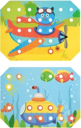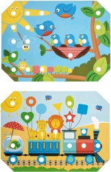 Kinderen kiezen een van de gekleurde sjablonen, leggen deze op de houten basis en vullen het plaatje met pinnen met behulp van het pincet of met de hand. Ze kunnen ook rijgen en borduren oefenen met de meegeleverde veters. Het spel ondersteunt op natuurlijke wijze concentratie, logisch denken, geduld en precisie.