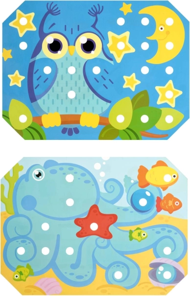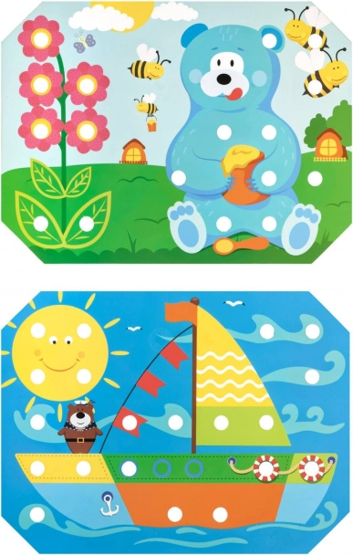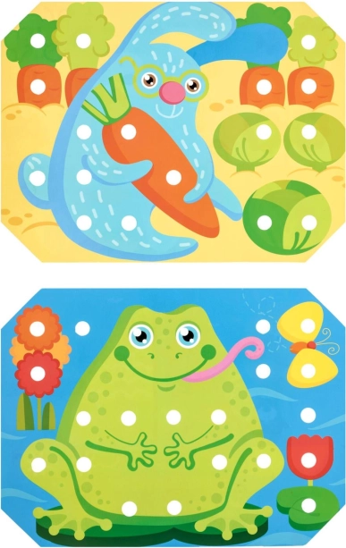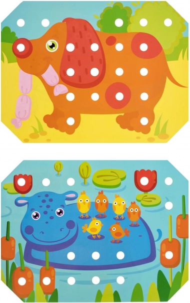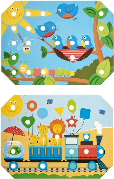 Ontdek een creatieve houten set voor kinderen vanaf 3 jaar die de fijne motoriek, oog-handcoördinatie, kleurenherkenning en geduld ontwikkelt. De set bevat 70 grote gekleurde pinnen, een pincet, 12 dubbelzijdige sjablonen met dieren, een houten basis met gaatjes en 4 gekleurde veters om te borduren – een ideale Montessori-hulp voor spelenderwijs leren.