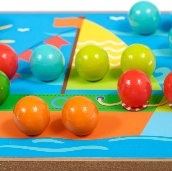 De houten basis met gaatjes, gekleurde pinnen en het pincet stimuleren kinderen tot een precieze greep en trainen zowel de fijne motoriek als de oog-handcoördinatie.