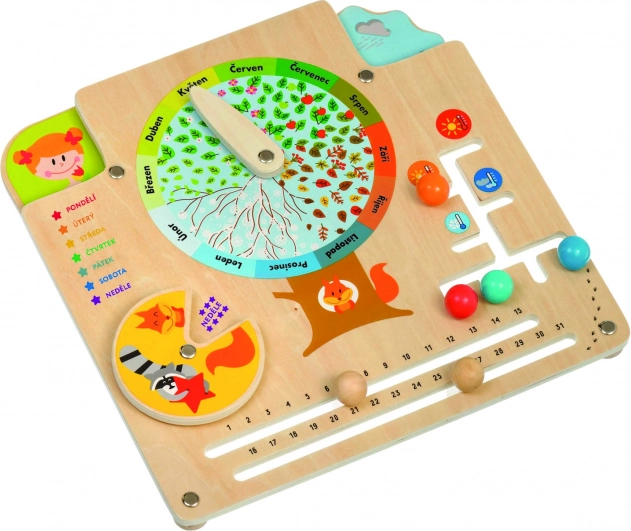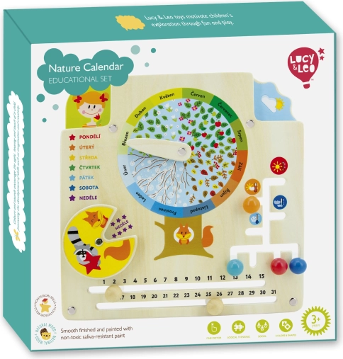 De houten natuurkalender van LUCY & LEO is een ideale hulp voor spelenderwijs leren. In het midden van de plaat staat een bladrijke fruitboom met een aanwijzer voor 12 maanden, waardoor kinderen eenvoudig de winter met sneeuw, de lente met bloesem, de zomer met fruit en de herfst met vallende bladeren kunnen verbinden. Kinderen leren daarnaast de dagen van de week, het aantal dagen in de maand, het weer, de temperatuur en passende kleding voor verschillende omstandigheden herkennen.