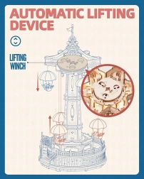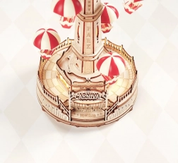 Deze verfijnde 3D houten puzzel is geïnspireerd op de klassieke parachutetoren uit het pretpark. De zeshoekige basis en de zijdelingse transparante ramen laten warm licht door, wat de unieke sfeer benadrukt. De molen wordt aangedreven door een batterijmotor en verlicht met LED-lampjes, terwijl de touchbediening het mogelijk maakt beweging en geluid afzonderlijk te regelen.
